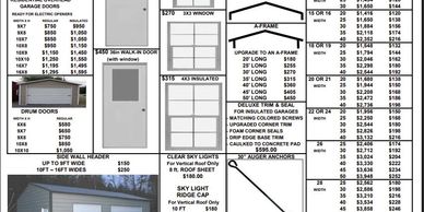 Extra bracing, windows, doors, drum and overhead doors, and insulation are available. Now available, clear sky lights. (For vertical roof only). Extra anchors and mobile home anchors are available for purchase. Some Garage quotes include walk-in door and drum or overhead door.